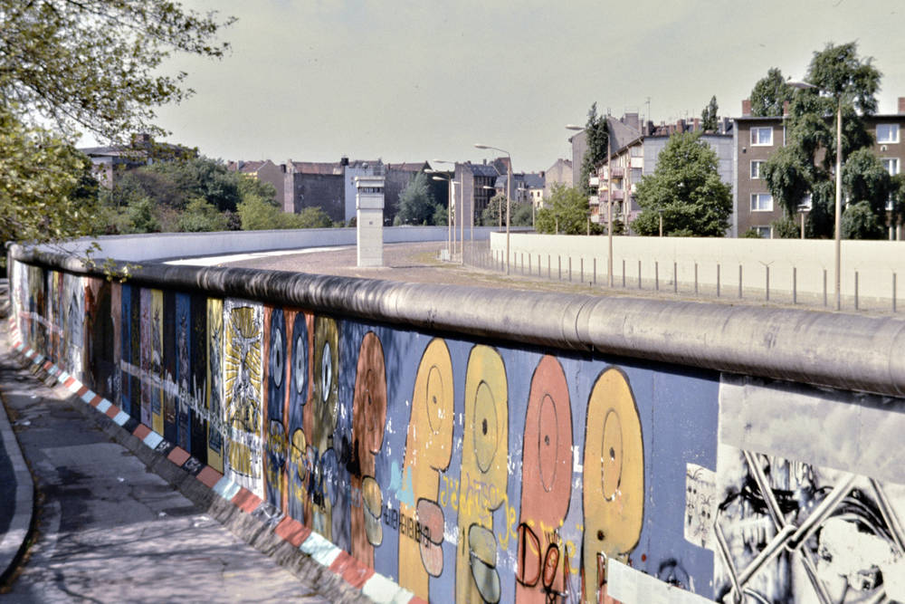 Grenzstreifen mit bemalten Mauerelementen am Bethaniendamm. Im Vordergrund sind Mauerelemente mit den charakteristischen "Köpfen" von Thierry Noir zu sehen, 1989 (Foto: Stiftung Berliner Mauer / Detlef Gallinge, CC BY-SA 4.0)
