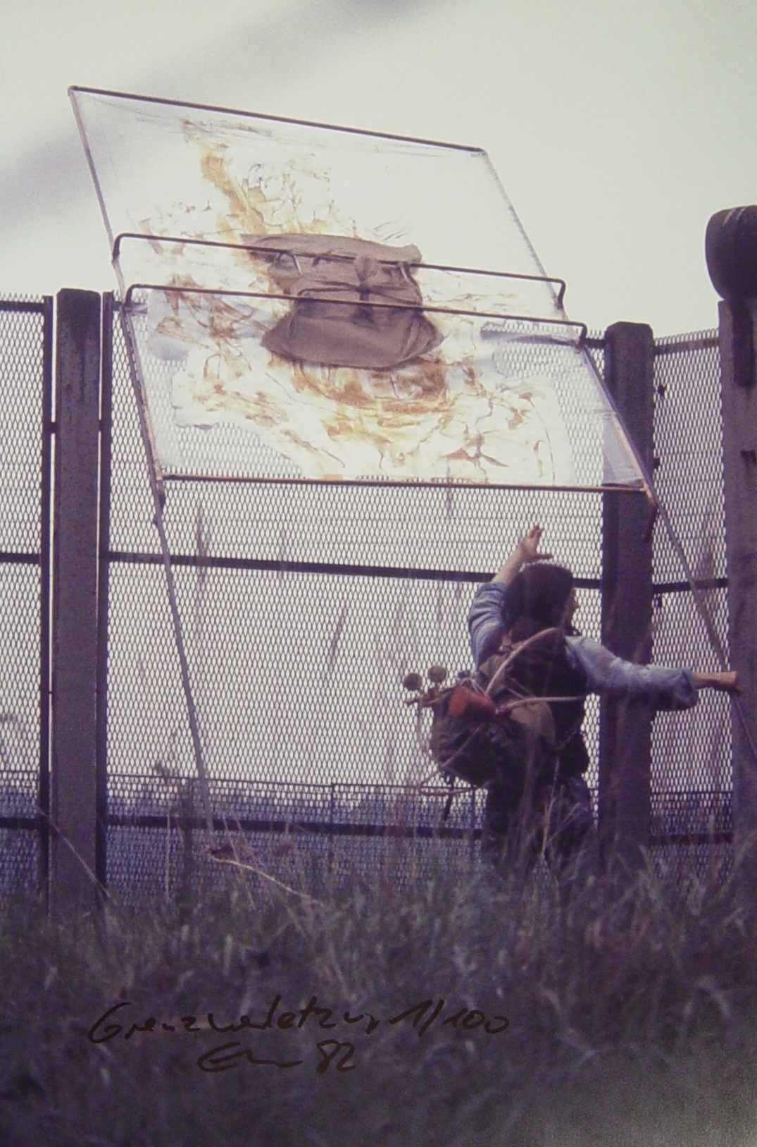 Stephan Elsner hievt seine Konstruktion aus Rohrrahmen mit aufgespannter Plastikfolie über den Streckmetallzaun am Außenring der Berliner Mauer, um Abdrücke davon zu nehmen, 1982 (Foto: Scheid / Fähnle-Scheid)