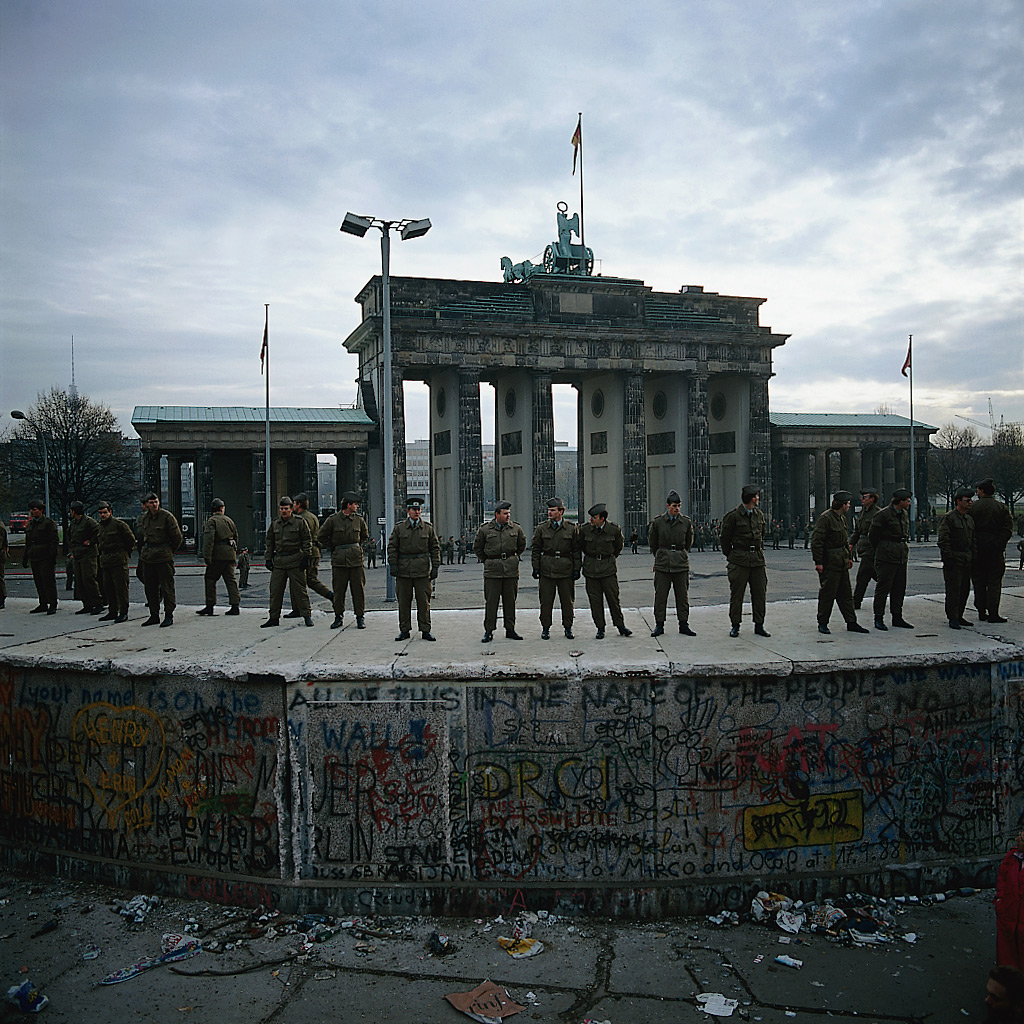 Grenzsoldaten der DDR haben die Mauerkrone besetzt, um das Besteigen zu verhindern, 11. November 1989. (Foto: Walter Ludwigs)